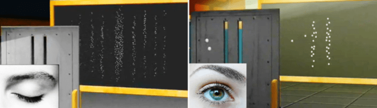 “이중슬릿 실험의 관찰자 효과”라는 현상인데, 이중슬릿에 전자를 하나씩 쏘면 파동의 특성인 간섭현상으로 인해서 여러 줄이 나타난다. 하지만 똑같이 실험하는 조건에서 이중슬릿을 지나는 전자가 하나씩 지나가는지 관측자가 확인해 가면서 실험하면 빛은 입자의 특성을 나타내며 2줄만 나타난다.
