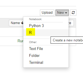 실행된 Jupyter notebook에 접속하여 “New”버튼을 눌러 확인해보자. 다음과 같이 R programming을 할 수 있는 R Notebook을 생성할 수 있을 것이다.