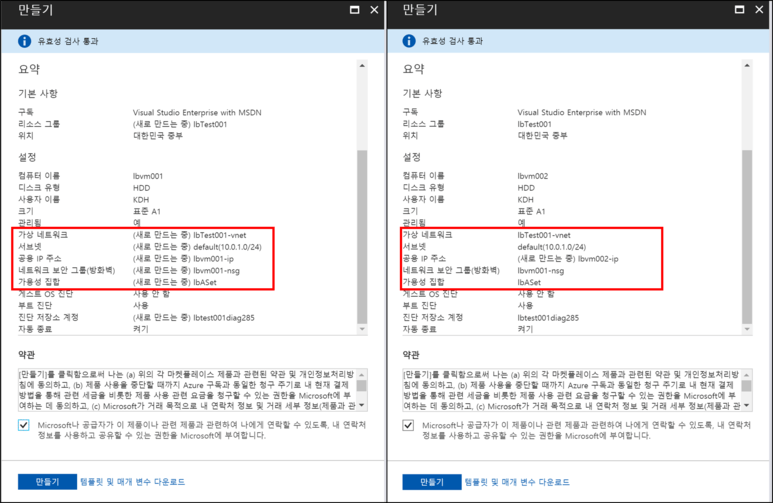 위 그림을 살펴보면, 좌측 1번째 VM은 생성할 때 가상 네트워크, 서브넷, 네트워크 보안 그룹(방화벽), 가용성 집합을 새로 만드는 것을 확인할 수 있다. 그리고 우측 2번째 VM은 1번 VM을 생성했을 때 만들어진 것들을 그대로 사용하여 같은 가상 네트워크 서브넷과 가용성 집합 내에 만들어지는 것을 확인할 수 있다.