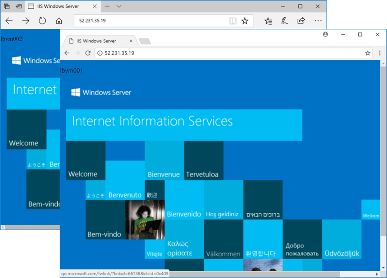 1~4번까지 설정이 완료되면, Load Balancer의 공용 IP(혹은 DNS) 주소를 가지고 사이트에 접근해보자. 브라우저 세션 강제 삭제 및 새로 고침(F5)을 몇 번 해보면 부하 분산 규칙에 따라 사이트(VM 2대)가 바뀌는 것을 볼 수 있다.
